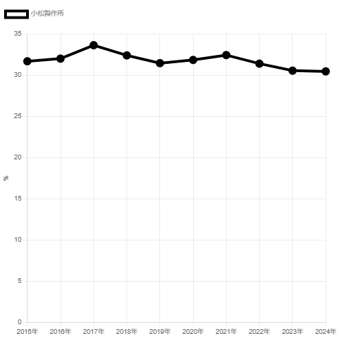 下記は小松製作所の売上高・売上高営業利益率・売上高経常利益率の3グラフです。売上高経常利益率は売上高営業利益率を上回っており、その乖離が大きくなっています。通常、営業効率を示す財務指標のグラフでは、このような見え方になります。